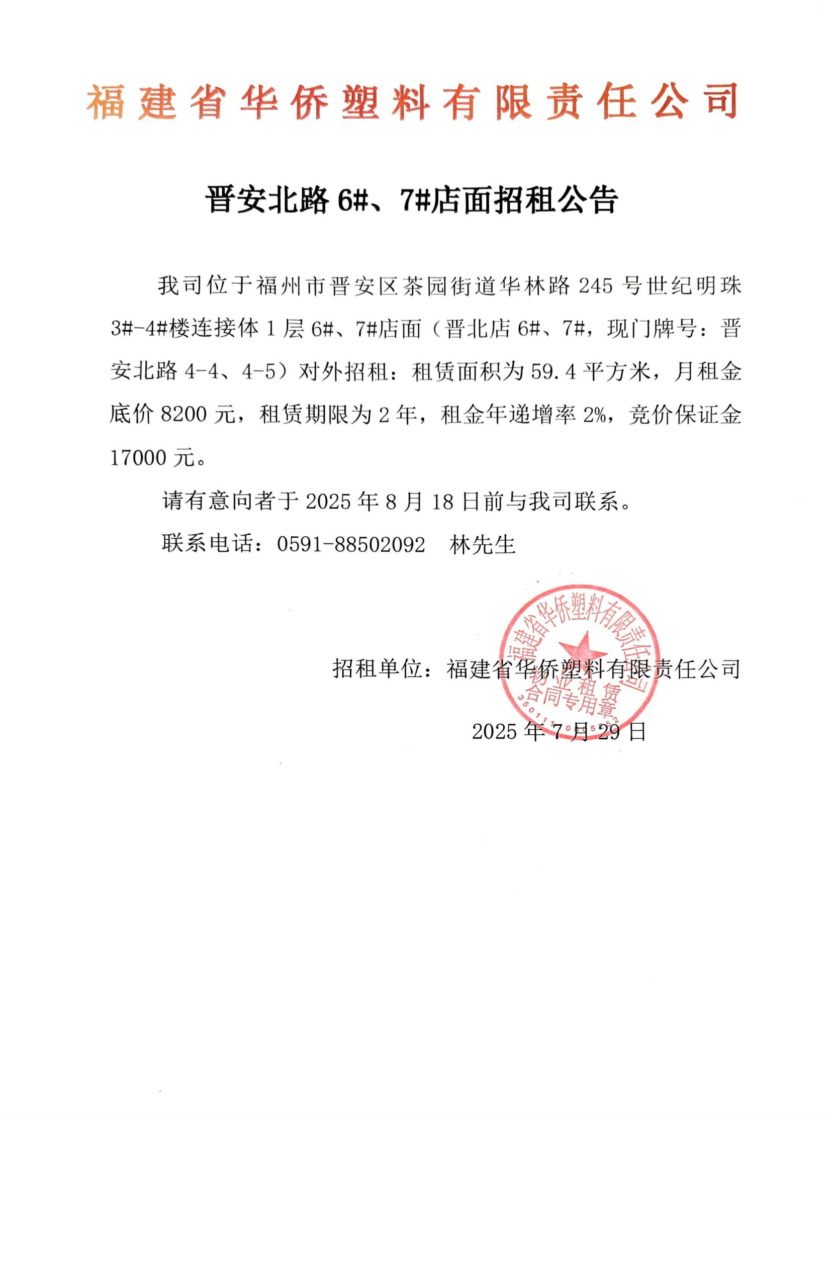 晉安北路6#、7#店面招租公告