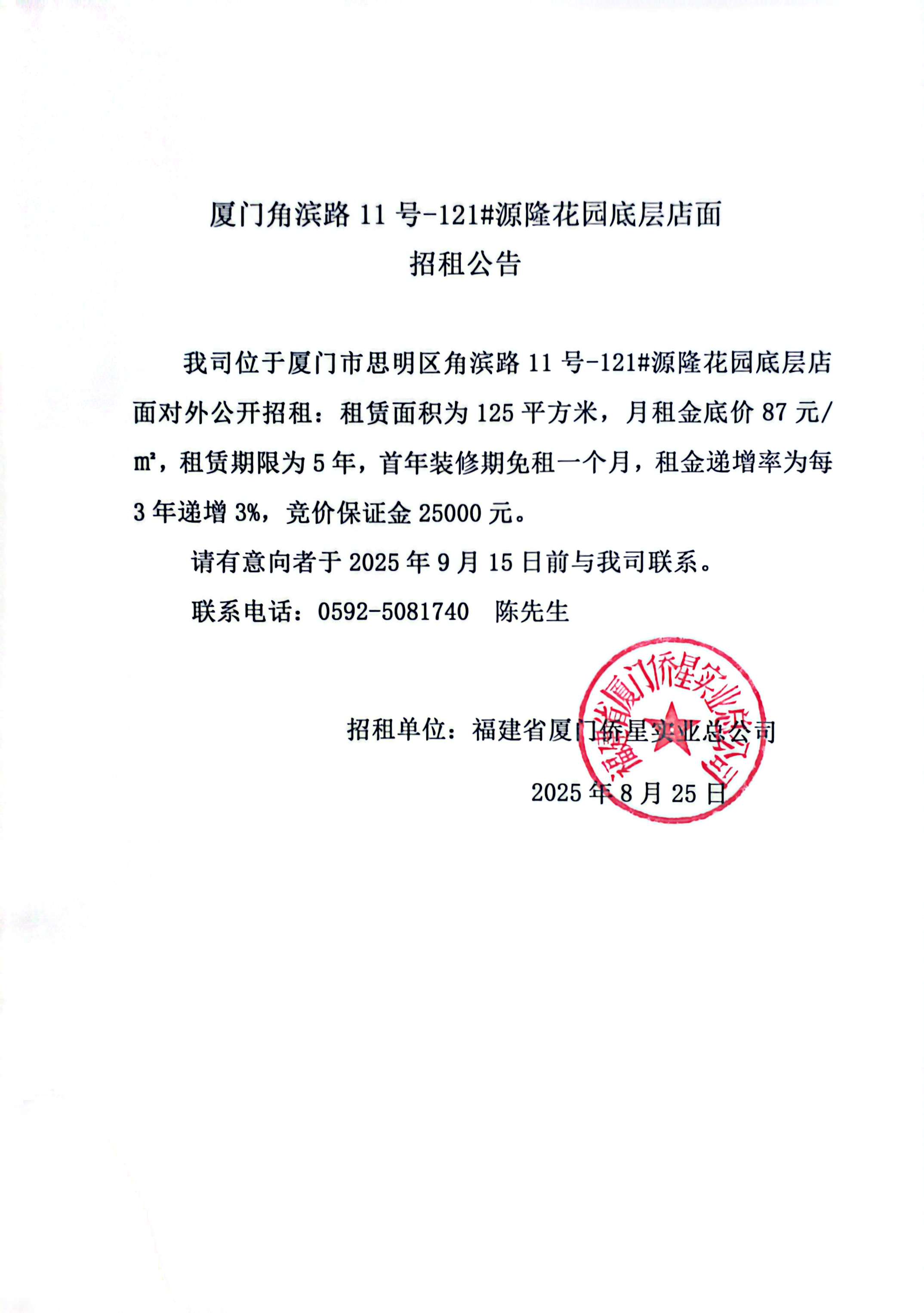 廈門角濱路11號(hào)-121#源隆花園底層店面招租公告
